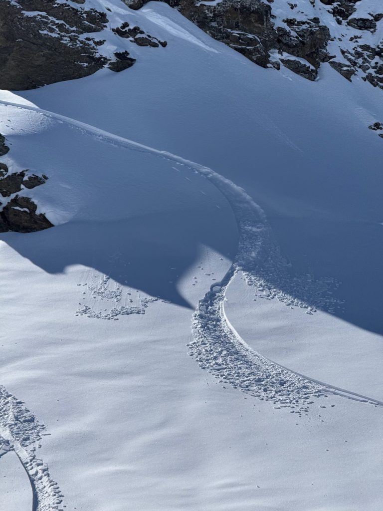 In der Nacht zum Mittwoch fielen 15–20 cm Neuschnee, was uns am Donnerstag einige unerwartet schöne Abfahrten bescherte. Dann kam der Samstag. Der Morgen begann mit Regen im Dorf, doch mit den sinkenden Temperaturen sank auch die Schneefallgrenze und schon bald war das Dorf wieder weiss. Man kann definitiv sagen, dass wir darüber ziemlich glücklich waren. Hier ist unser Pulverschnee-Alarm!