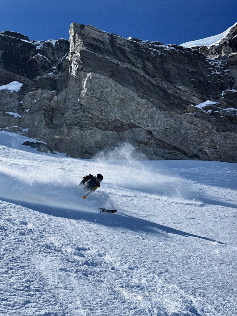 This week kicked off with a small but very welcome refill, around 10 cm of that hail/styrofoam-looking snow the Swiss call graupel. Not the usual powder, but hey, it sprays pretty well for photos and we’re not complaining.